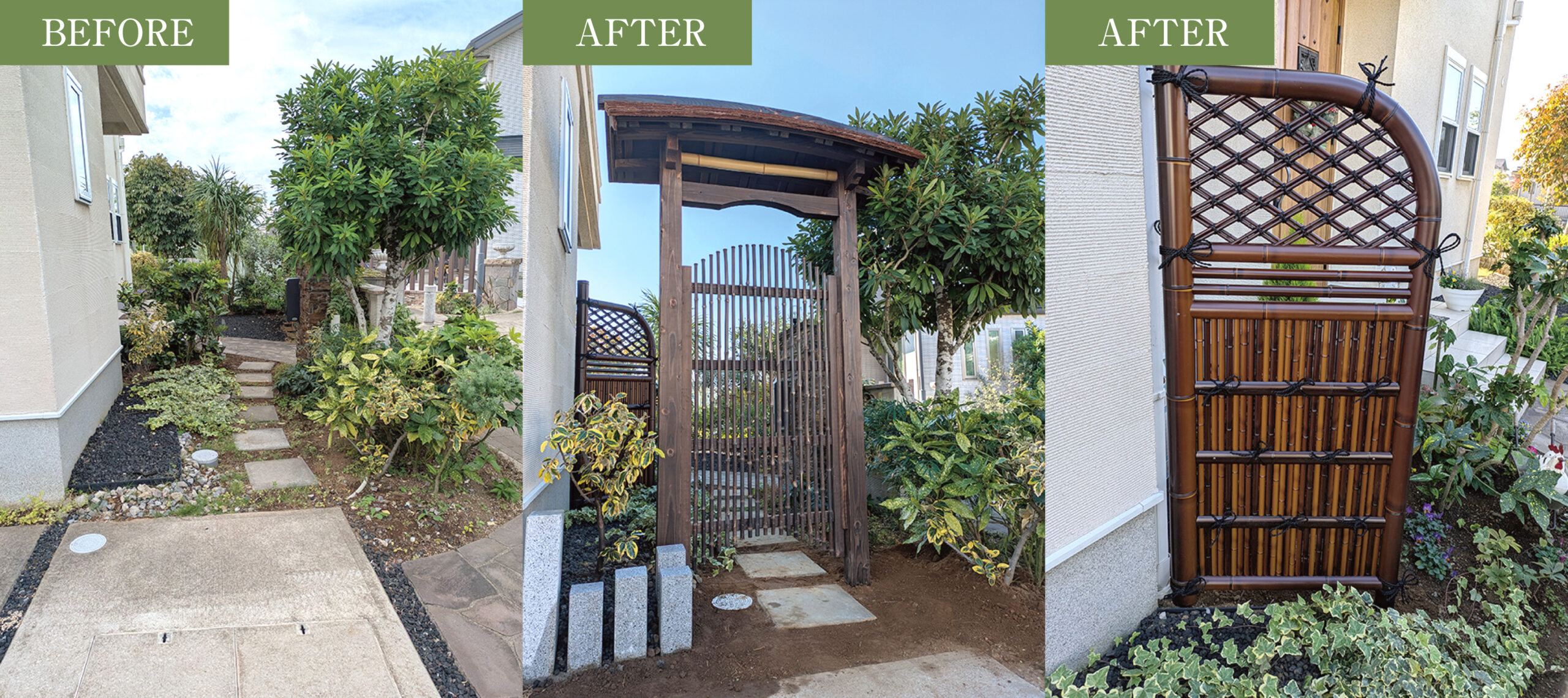 伝統の技術が息づく、本格和風くぐり門と袖垣の施工。(天然船形露地門:タカショー)