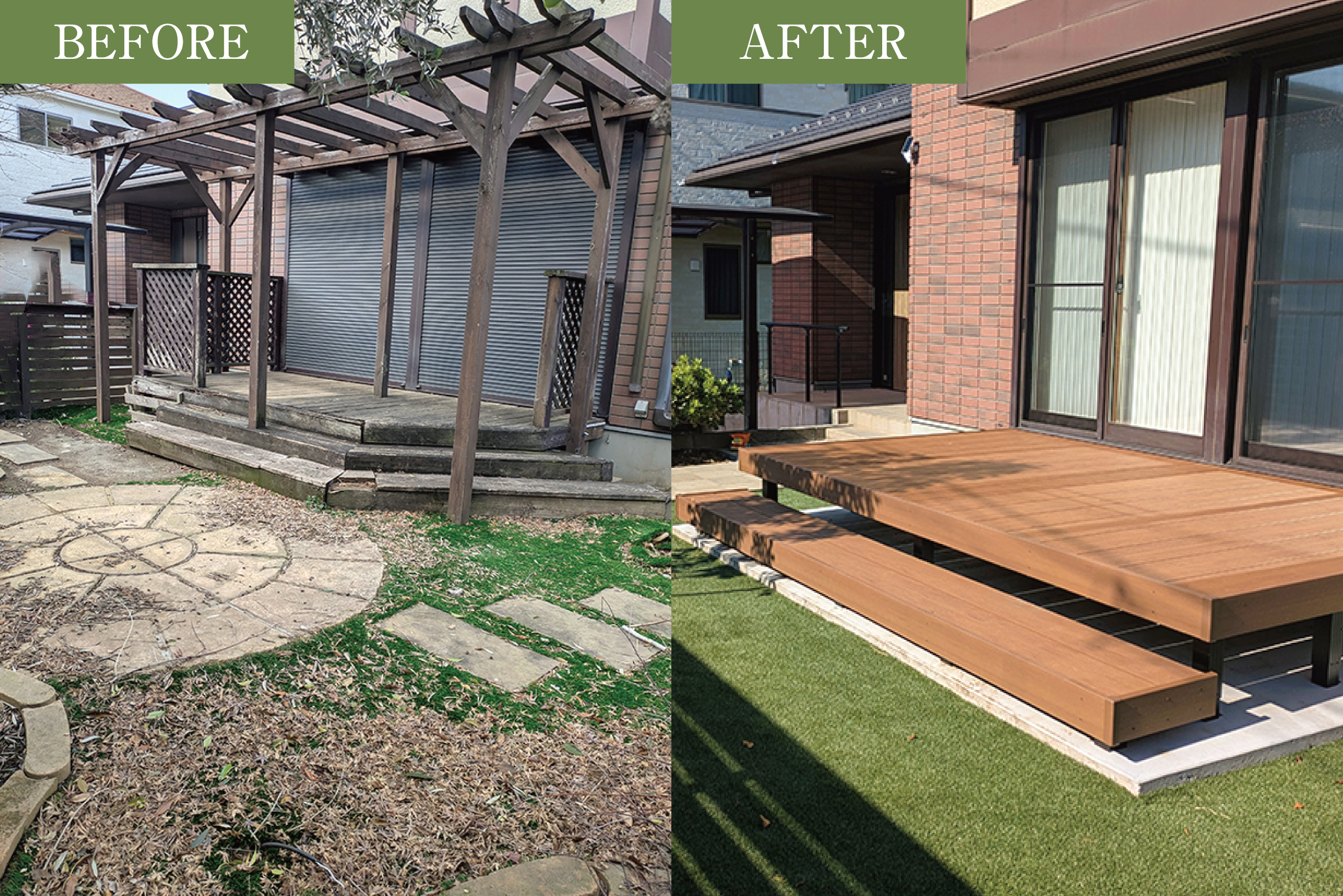 朽ちてしまったウッドデッキとパーゴラは撤去し、新しく人工木のウッドデッキを施工しました。